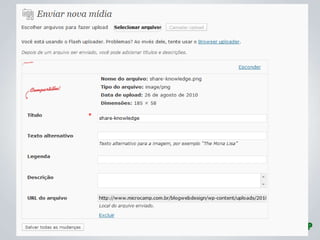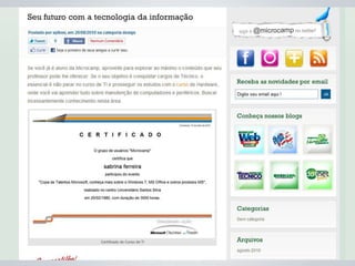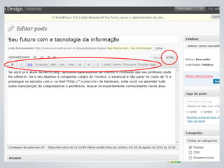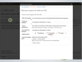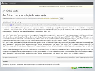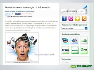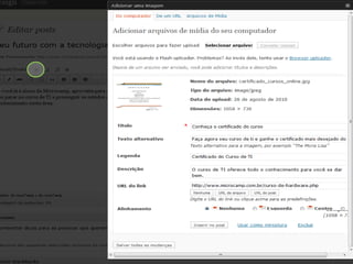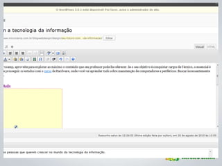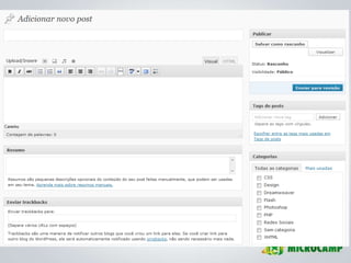 O documento apresenta diretrizes para a criação e gerenciamento de blogs da Microcamp, enfatizando a importância de conteúdo de qualidade e estratégias de SEO. Inclui instruções sobre uso do WordPress, elaboração de posts e como viralizar conteúdo nas redes sociais. Além disso, destaca as vantagens de participação dos professores e o impacto positivo que isso pode ter na credibilidade da instituição.