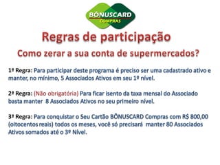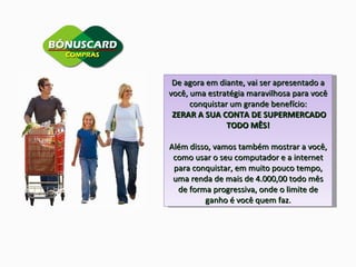 O documento descreve um programa de marketing multinível que promete zerar a conta de supermercado e gerar renda mensal de R$4.000 através da indicação de novos membros. Quanto mais membros indicados, maiores os bônus recebidos em compras e dinheiro. O documento incentiva a divulgação agressiva do programa em redes sociais e locais públicos.