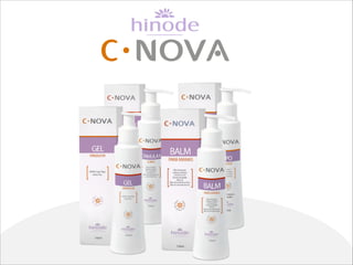 O documento descreve uma linha de produtos dermocosméticos chamada C-Nova, incluindo seus benefícios e indicações. A linha inclui um balm para mamas para hidratação, um creme para clareamento de estrias, um gel firmante e um creme redutor de celulite. Todos os produtos contêm ingredientes ativos naturais e são indicados para melhorar a aparência e saúde da pele.