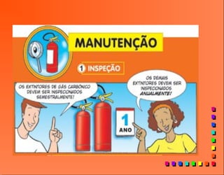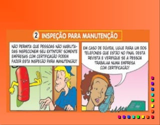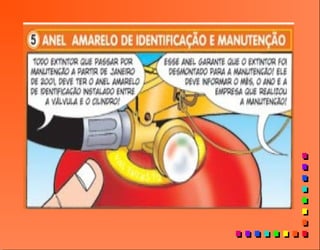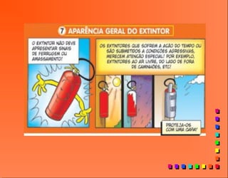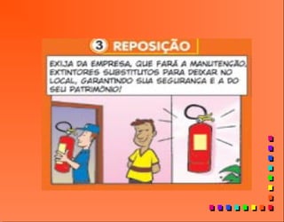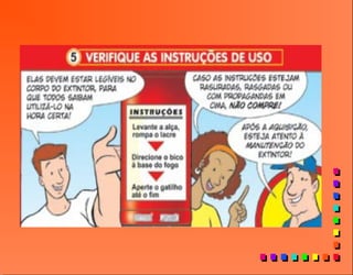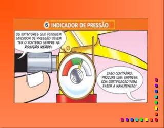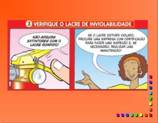 Como proceder aoUsar um ExtintorComo proceder ao Usar um Extintor 1. Puxe a trava de segurança1. Puxe a trava de segurança 2. Aponte o bocal da mangueira do2. Aponte o bocal da mangueira do extintor para a base das chamasextintor para a base das chamas 3. Mantenha o extintor na posição vertical3. Mantenha o extintor na posição vertical a aperte o gatilho.a aperte o gatilho. 4. Movimente a mangueira de um lado4. Movimente a mangueira de um lado para o outro e aplique o agente extintorpara o outro e aplique o agente extintor sobre a área do fogo.sobre a área do fogo.
