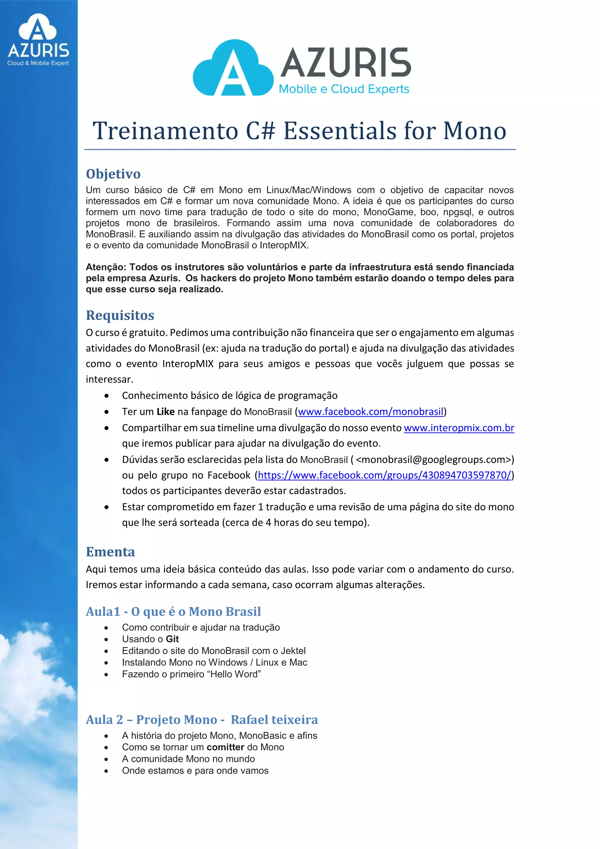 Este documento descreve um curso gratuito de C# com o objetivo de capacitar novos desenvolvedores e formar uma comunidade de tradução para projetos Mono no Brasil. O curso será ministrado por voluntários e contará com 10 aulas semanais sobre tópicos como introdução ao C#, orientação a objetos, banco de dados e desenvolvimento de jogos.