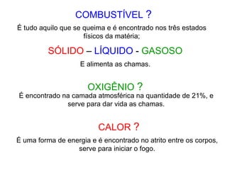 O documento descreve os elementos necessários para um incêndio - combustível, oxigênio e calor - e classifica os tipos de incêndio e materiais combustíveis. Ele também explica os objetivos de treinamento de brigada de incêndio de reconhecer riscos e propor medidas preventivas.