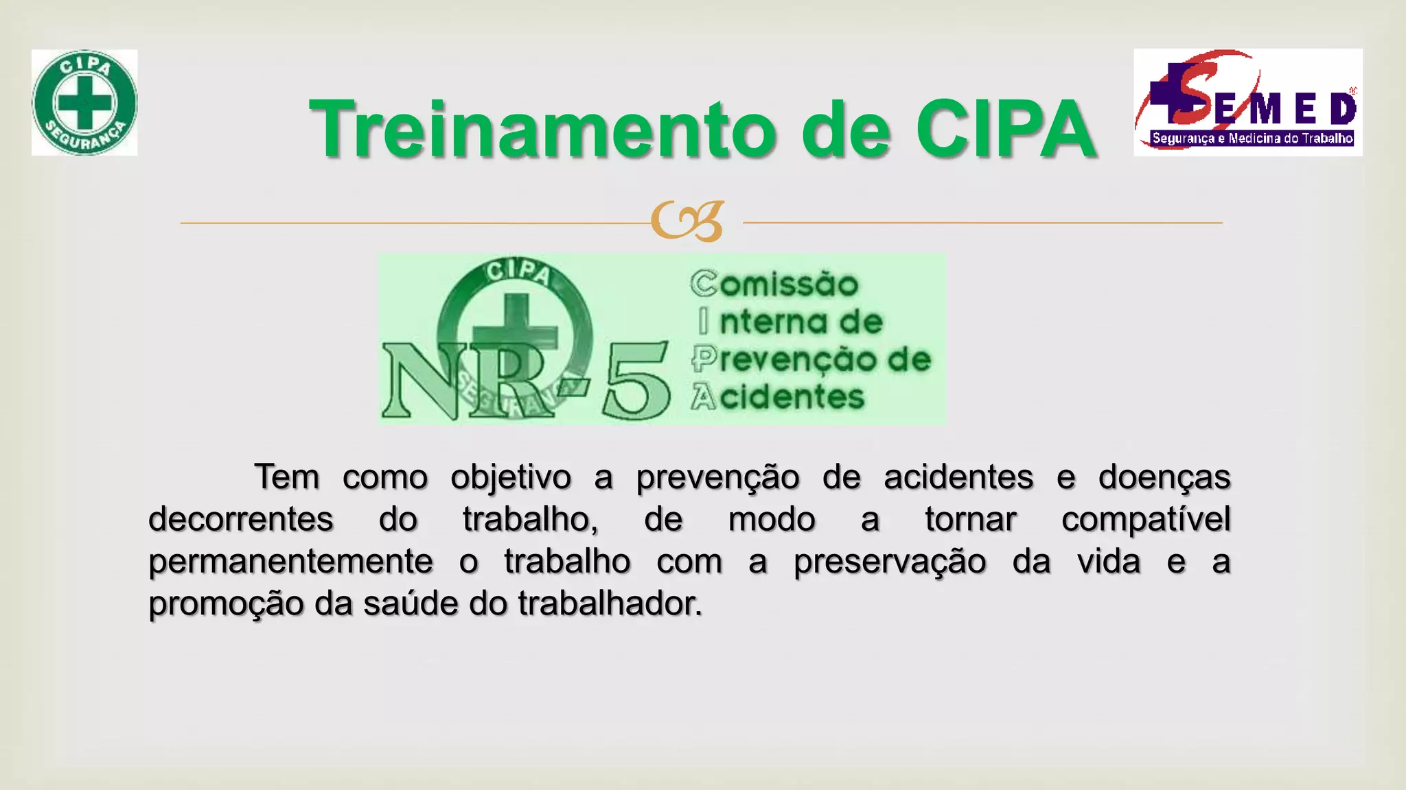 O documento discute treinamento de CIPA, identificando e classificando diversos riscos à saúde no ambiente de trabalho, como riscos físicos, químicos, biológicos, ergonômicos, mecânicos e ambientais. Ele também aborda a elaboração de mapas de risco, inspeções de segurança, acidentes do trabalho e obrigações dos empregadores e empregados.