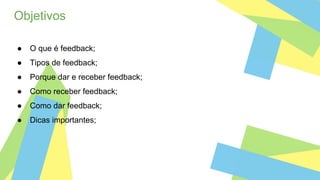 O documento aborda o conceito de feedback, seus tipos e a importância de dar e receber feedback de maneira eficaz. Destaca como o feedback pode melhorar relacionamentos interpessoais, produtividade e motivação, apresentando diretrizes práticas para receber e oferecer feedback. Inclui também dicas importantes para tornar o processo mais produtivo e assertivo.
