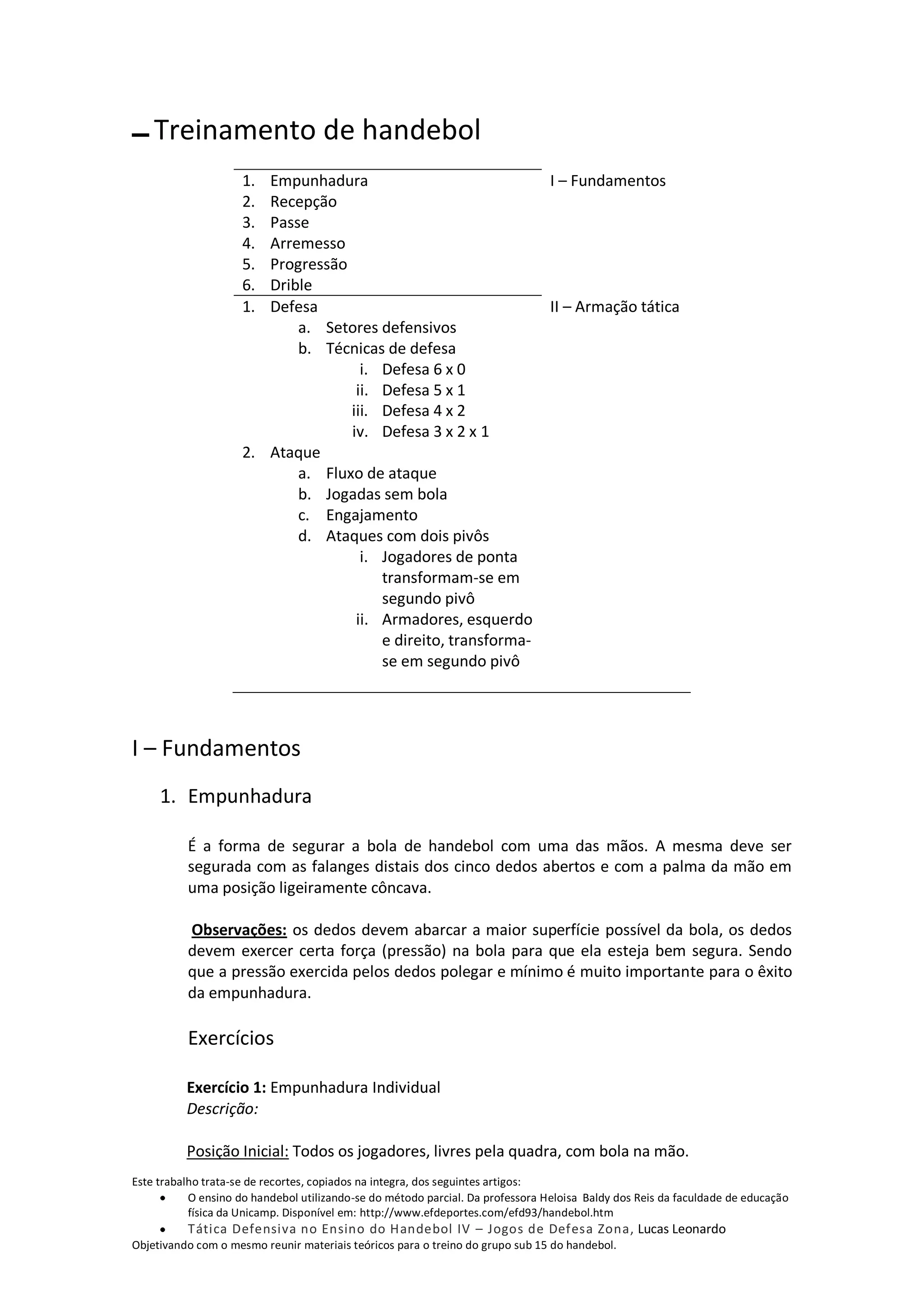 Este documento apresenta os fundamentos e técnicas básicas do handebol, incluindo empunhadura, recepção, passes e arremessos. Também descreve estratégias defensivas e ofensivas como diferentes formações defensivas (6x0, 5x1, 4x2, 3x2x1) e princípios do ataque como fluxo e jogadas sem bola.