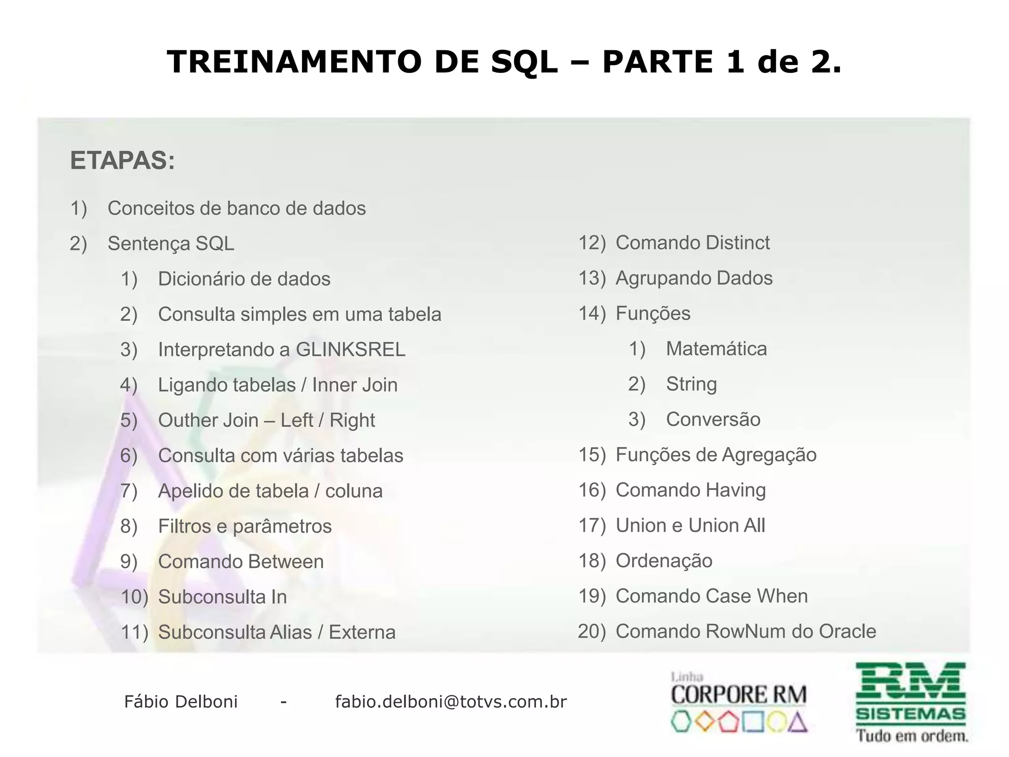 O documento apresenta um treinamento sobre SQL dividido em duas partes. Ele aborda diversos comandos e conceitos como agrupamento de dados, funções, ordenação, joins e subconsultas. Também explica conceitos básicos de banco de dados como SGBD, tabelas, chaves e a linguagem SQL.