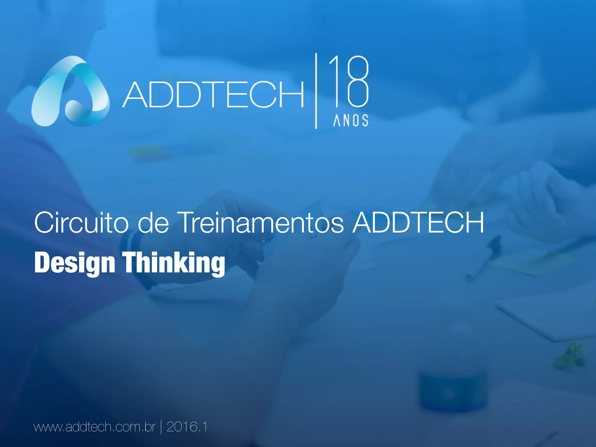 O documento aborda a abordagem de design estratégico aplicada a treinamentos e consultorias da Addtech, destacando sua experiência em inovação e gestão de projetos. Apresenta conceitos de design thinking e a importância de entender o valor para os clientes, além de detalhar técnicas de facilitação e criatividade em dinâmicas de grupo. Também discute a necessidade de adaptação e a importância de compreender a perspectiva do cliente para gerar soluções eficazes.