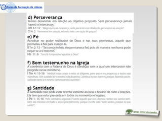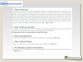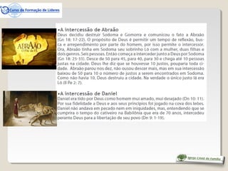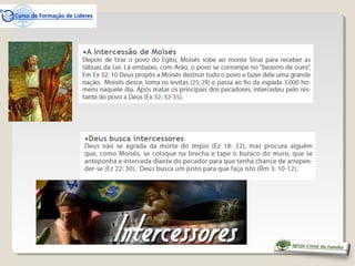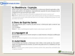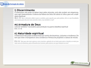O documento discute o significado e características da intercessão, identificando requisitos e compromissos para fazer parte do ministério de intercessão na igreja. A igreja é chamada a interceder e está envolvida em batalha espiritual, portanto os membros devem se comprometer com a intercessão.