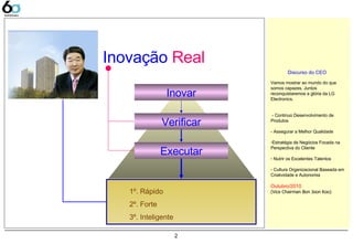 - O documento apresenta os conceitos e métodos do Treinamento 6σ na LG Electronics, incluindo: 1) A importância da inovação e do gerenciamento 6σ para a empresa; 2) Os objetivos, princípios e métodos do 6σ; 3) A estrutura do departamento de gerenciamento de inovação da LG responsável pelo 6σ.