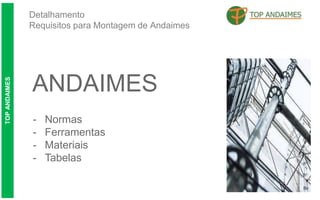 O documento descreve os requisitos e procedimentos para a montagem e desmontagem de andaimes, incluindo equipamentos de proteção individual, ferramentas, materiais permitidos, sinalização, fixações, cargas suportadas, diagonais e demais elementos estruturais.