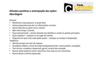 O documento fornece diretrizes para o atendimento de qualidade a clientes, enfatizando a importância da cortesia, da escuta ativa, do conhecimento dos produtos e serviços, e da disponibilidade com bom humor. Também discute a necessidade de treinamento para os funcionários melhorarem continuamente o atendimento.
