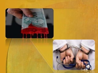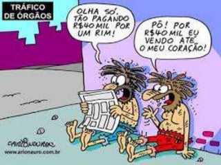 O documento discute o tráfico de órgãos, que atinge populações vulneráveis em todo o mundo. O objetivo é estudar esse mercado ilegal em mais detalhes. O tráfico de órgãos está relacionado ao novo crime internacional do século 21 e ocorre com maior incidência em países como China, Índia, Paquistão, Rússia e Brasil. A pobreza leva mais pessoas a recorrerem a métodos extremos para obter dinheiro, como vender órgãos, e o tráfico se tornou o terceiro crime mais lucrat