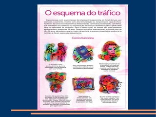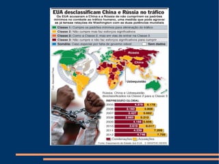 Tráfico humano envolve o comércio de seres humanos para fins sexuais, trabalho forçado ou remoção de órgãos, movimentando bilhões em 2010. É condenado pelas Nações Unidas como violação dos direitos humanos. Diferentemente do contrabando de imigrantes, o tráfico envolve exploração da vítima após a chegada através de meios como coerção. No Brasil, casos de tráfico aumentaram seis vezes entre 2010-2012, principalmente de mulheres negras e pardas.