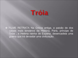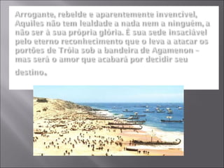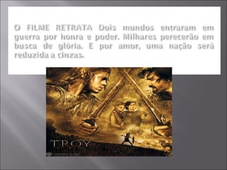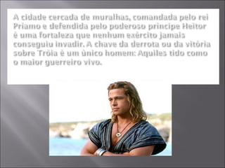 O documento descreve a Guerra de Troia, iniciada pela paixão de Páris e Helena e que levou a uma batalha inicial vencida por Troia. No entanto, Ulises teve a ideia de construir um Cavalo de Madeira que permitiu aos gregos capturar Troia. Apesar da vitória grega, Aquiles morreu de uma flechada em seu calcanhar.