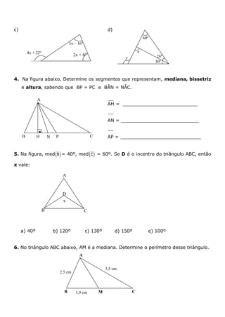 Este documento contém uma lista de exercícios de geometria sobre triângulos para o 4o bimestre do 8o ano. A lista inclui exercícios sobre classificação de triângulos de acordo com lados e ângulos, cálculo de medidas desconhecidas em triângulos, identificação de elementos como medianas, alturas e bissetrizes, casos de congruência de triângulos e resolução de problemas envolvendo triângulos.