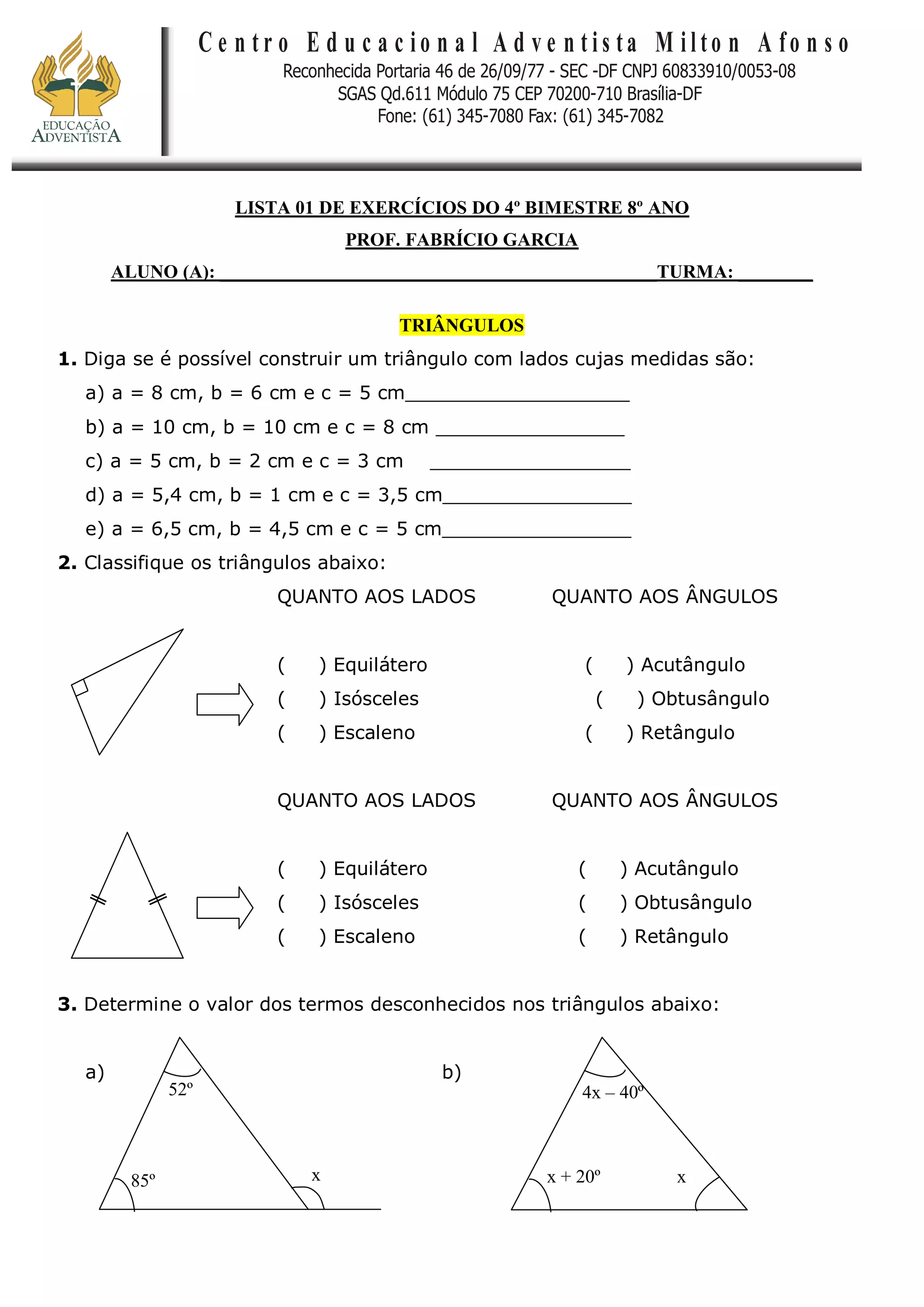 Este documento contém uma lista de exercícios de geometria sobre triângulos para o 4o bimestre do 8o ano. A lista inclui exercícios sobre classificação de triângulos de acordo com lados e ângulos, cálculo de medidas desconhecidas em triângulos, identificação de elementos como medianas, alturas e bissetrizes, casos de congruência de triângulos e resolução de problemas envolvendo triângulos.