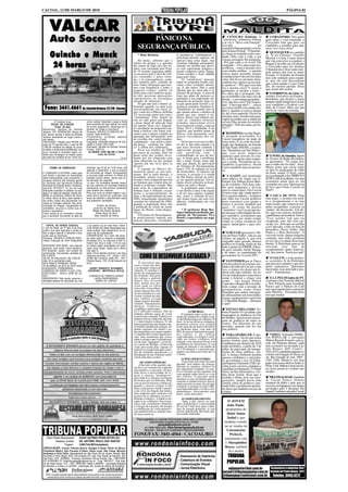 O documento resume as seguintes notícias: 1) O prefeito de Cacoal anuncia mudanças na saúde pública municipal, incluindo a inauguração de um instituto de oncologia e a transferência da Unidade Mista para o Hospital São Daniel Comboni; 2) O prefeito de Ministro Andreazza viaja a Brasília para buscar recursos, incluindo a reativação da rádio comunitária local; 3) A Faculdade de Ciências Biomédicas de Cacoal realizou ação de saúde com cerca de 2.500 atend