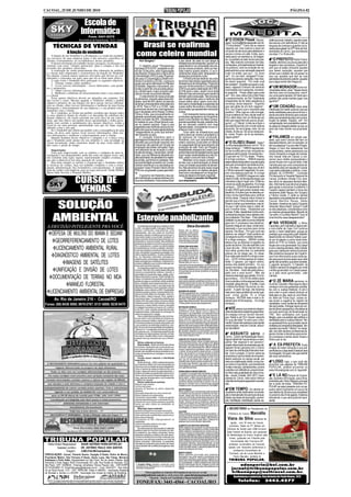 O documento é uma edição semanal do jornal "Tribuna Popular" de Cacoal, Rondônia, datada de 25 de junho de 2010. O jornal destaca que o Brasil será o maior produtor agrícola mundial na próxima década, segundo relatório da FAO e OCDE, e que a prefeitura de Cacoal promoveu reunião com empresários sobre fiscalização de atividades poluidoras. Além disso, anuncia promoção de venda de passaportes da Expoac em duas vezes até o dia 30.