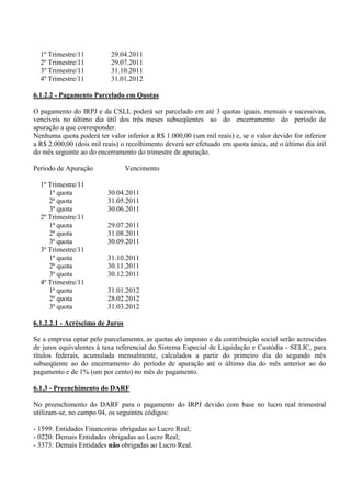 O documento descreve as 6 formas de apuração do lucro real para empresas, incluindo a apuração trimestral com prazos de recolhimento a cada 3 meses e a apuração anual com base no balanço anual de 31 de dezembro. A apuração trimestral pode gerar mais impostos a pagar caso haja variações nos resultados entre os trimestres.