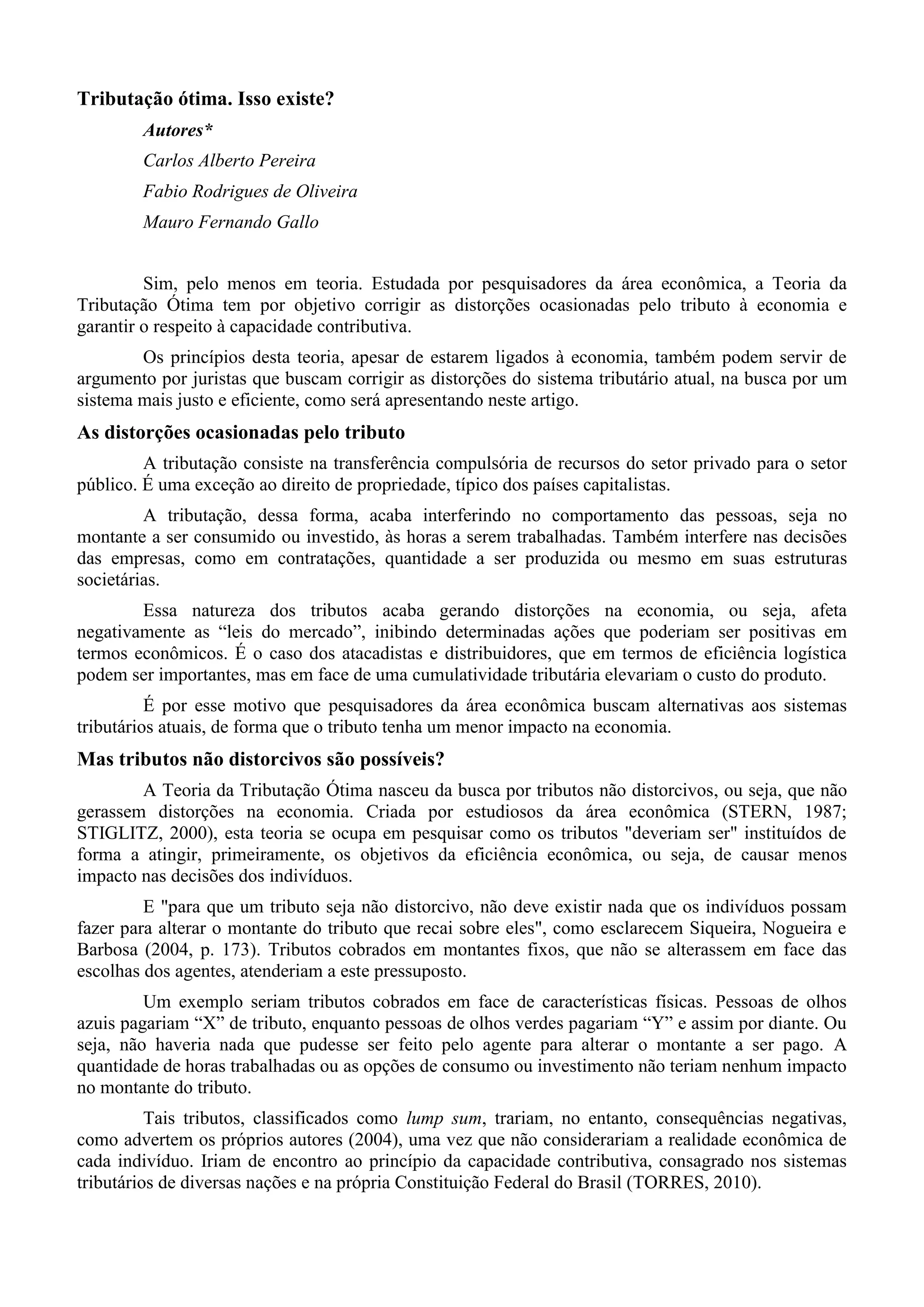 O documento discute a Teoria da Tributação Ótima, que busca tributos que minimizem distorções na economia e respeitem a capacidade contributiva. Ela equilibra eficiência e equidade ao propor o "segundo ótimo" em vez de soluções ideais irrealistas. Exemplos mostram como a teoria pode corrigir distorções em modelos tributários.