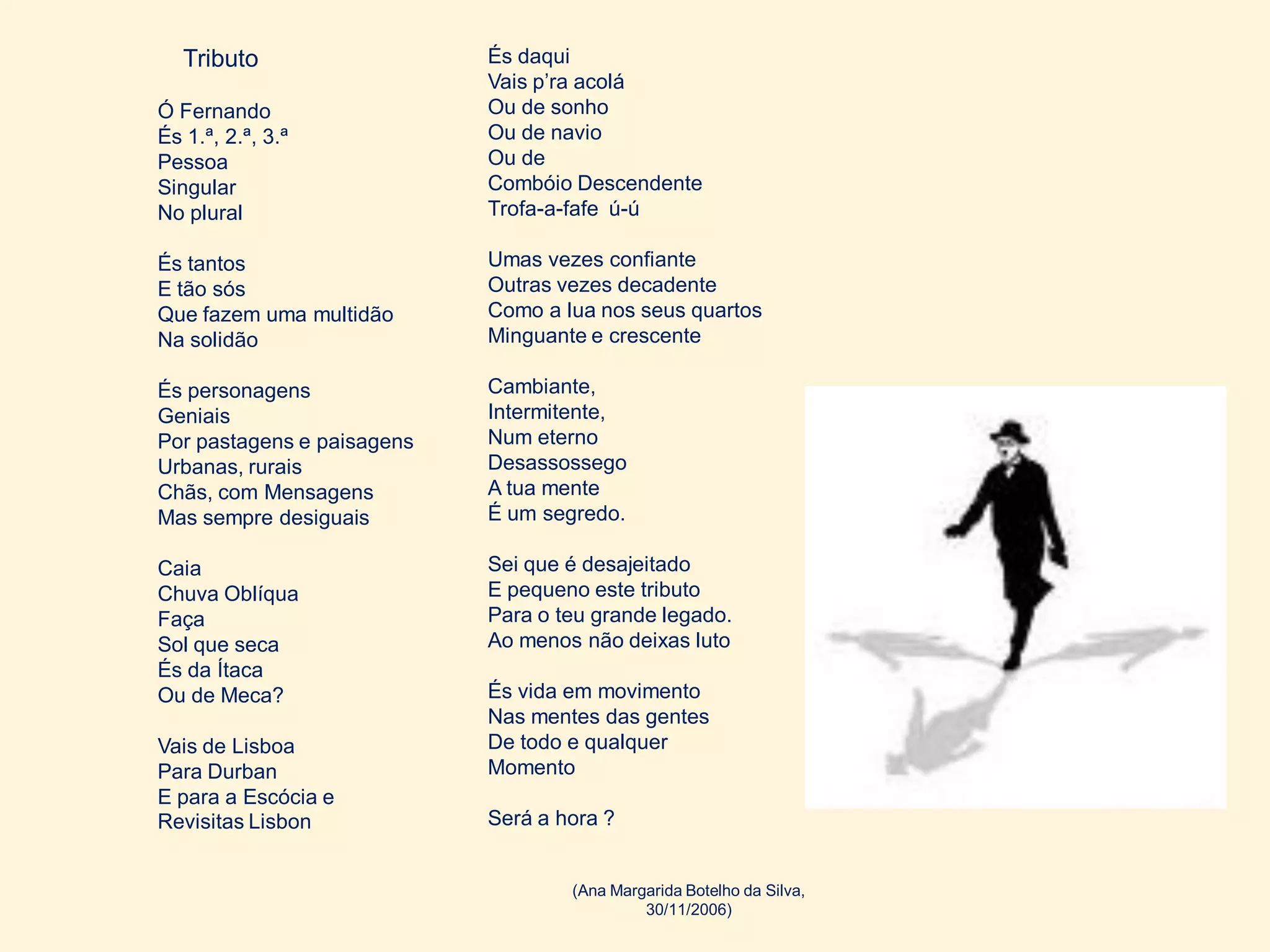 O poema descreve Fernando Pessoa como multifacetado, complexo e em constante mudança, comparando-o à lua em seus diferentes estágios e à vida em movimento. O poema celebra a vasta obra e o legado de Pessoa, apesar de reconhecer que este breve tributo não faz justiça à grandeza de seu trabalho.