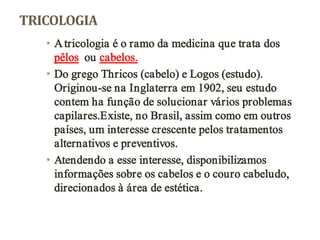 O documento discute a tricologia, o estudo científico dos cabelos e pêlos. Aborda a anatomia e morfologia dos folículos pilosos, as fases de crescimento dos pêlos, as características e cuidados com cabelos brancos e problemas capilares como caspa, dermatite seborreica e calvície feminina.
