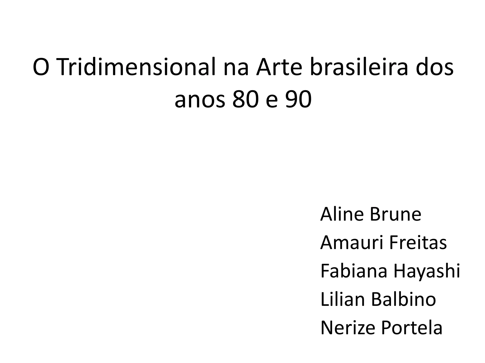 O documento discute a arte tridimensional brasileira dos anos 80 e 90, citando diversos artistas que ampliaram conceitos de escultura nesse período. Apresenta influências externas como Dadaísmo, Surrealismo e Arte Povera, e como artistas brasileiros como Leda Catunda, Nuno Ramos e Rosângela Rennó incorporaram essas tendências. Também reflete sobre legados deixados à geração seguinte, como o uso de materiais menos nobres.