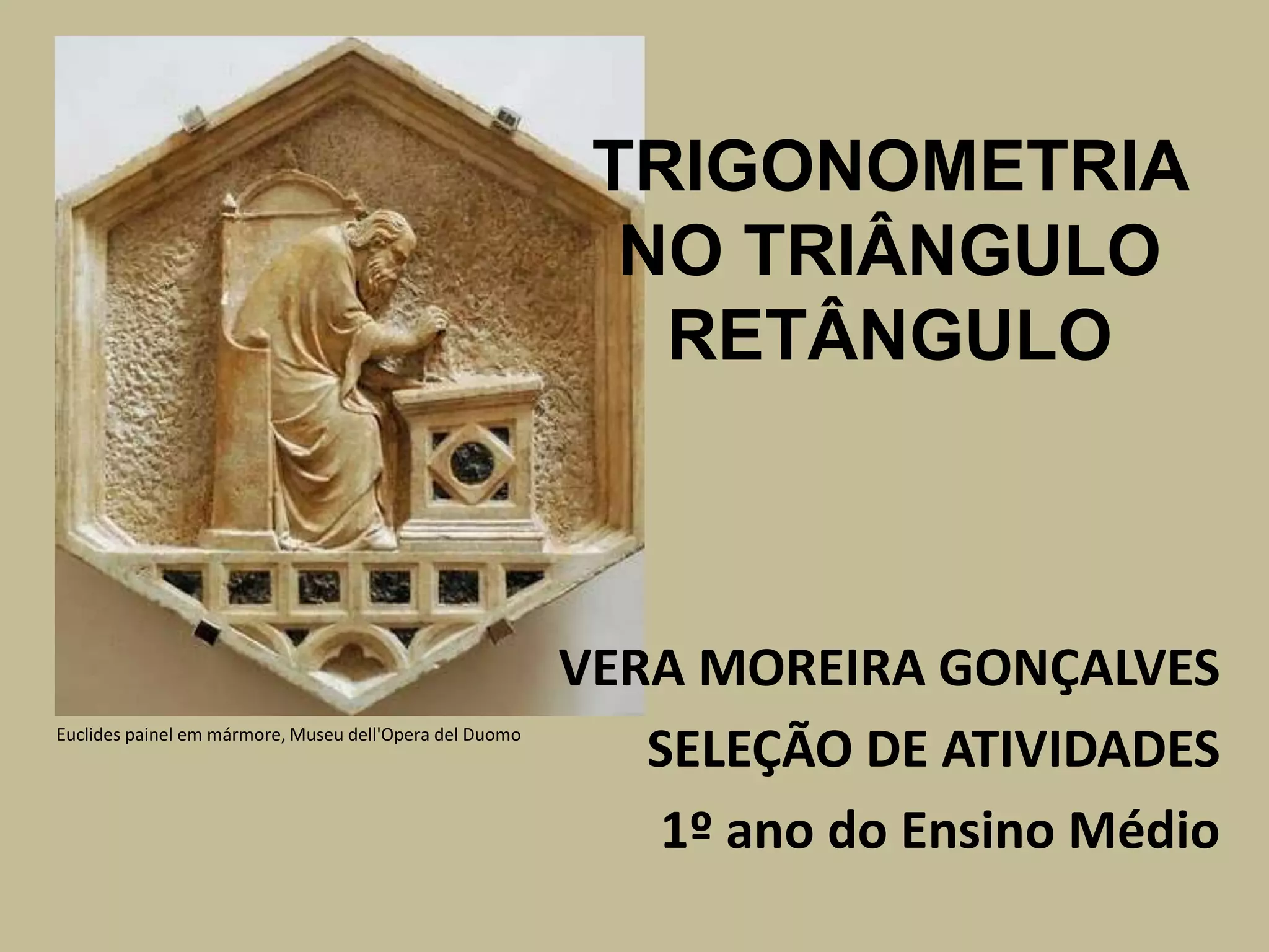 O documento apresenta um plano de aula sobre trigonometria no triângulo retângulo, incluindo definições, breve história, atividades práticas e um projeto final para construir um teodolito caseiro e calcular distâncias inacessíveis.