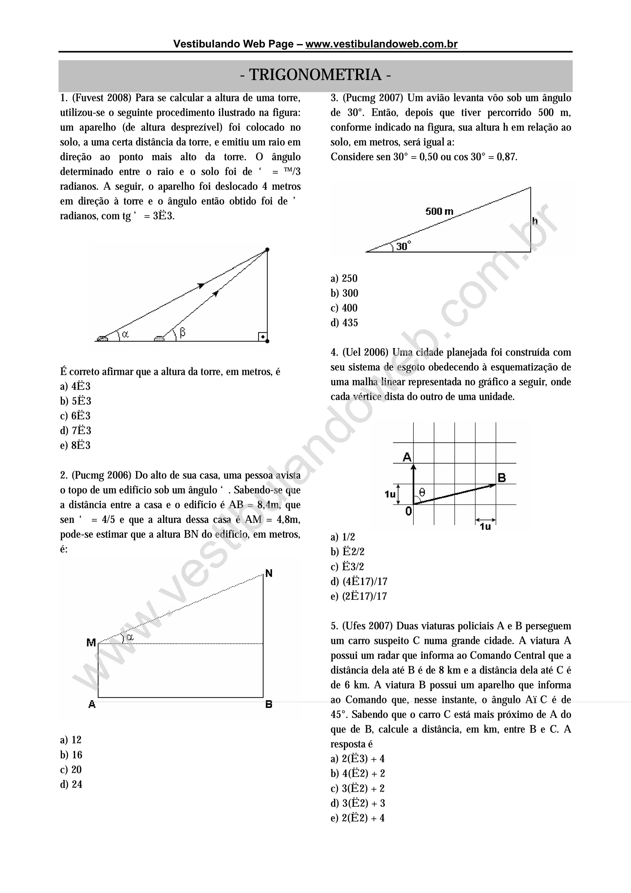 3. As questões devem ser resolvidas usando fórmulas trigonométricas, cálculos algébricos e geométricos.