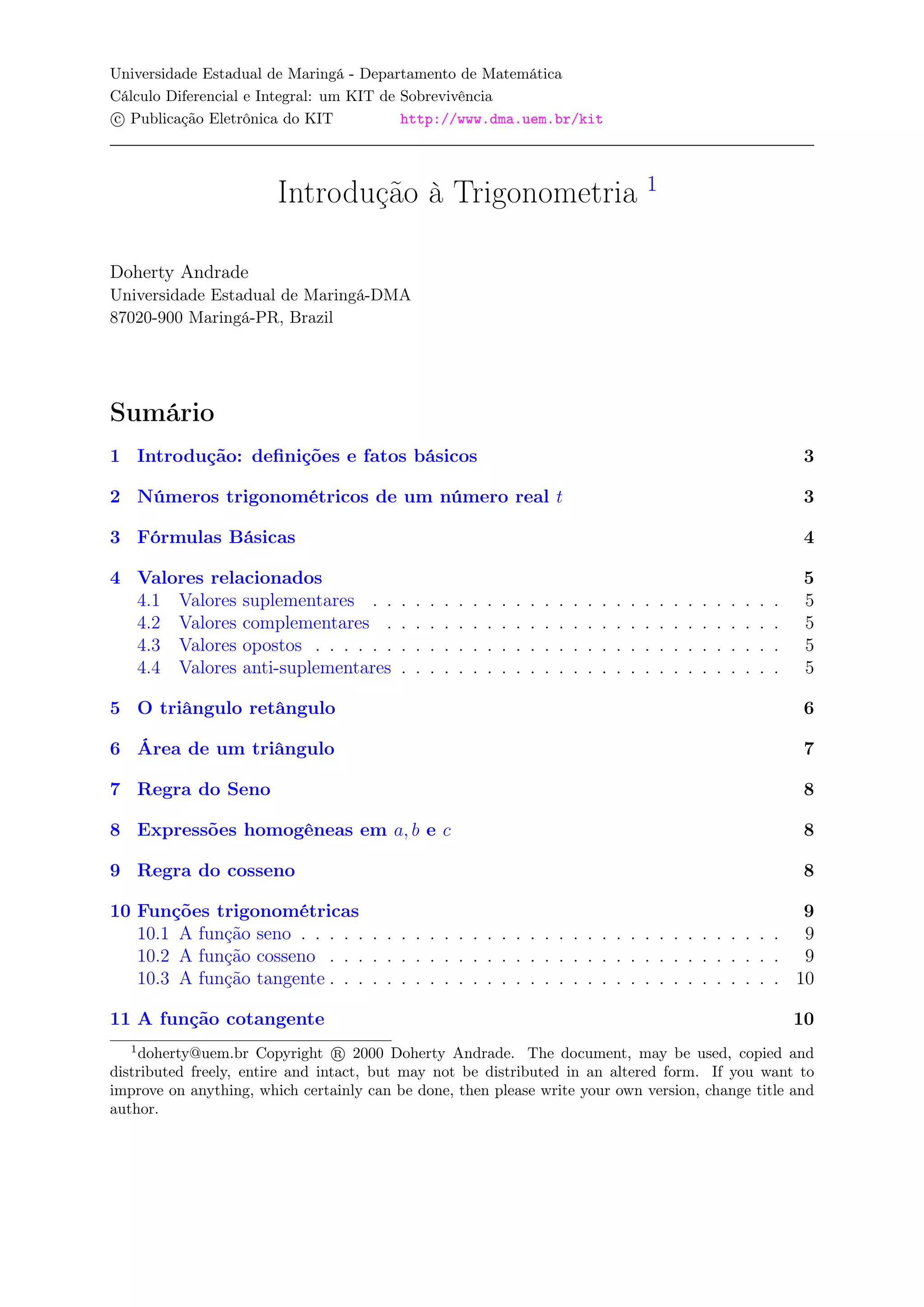 O documento apresenta uma introdução à trigonometria, definindo ângulos, círculo trigonométrico e funções trigonométricas básicas como seno, cosseno e tangente. Também aborda valores relacionados como valores suplementares, complementares e opostos, além de apresentar o teorema do triângulo retângulo e suas aplicações.