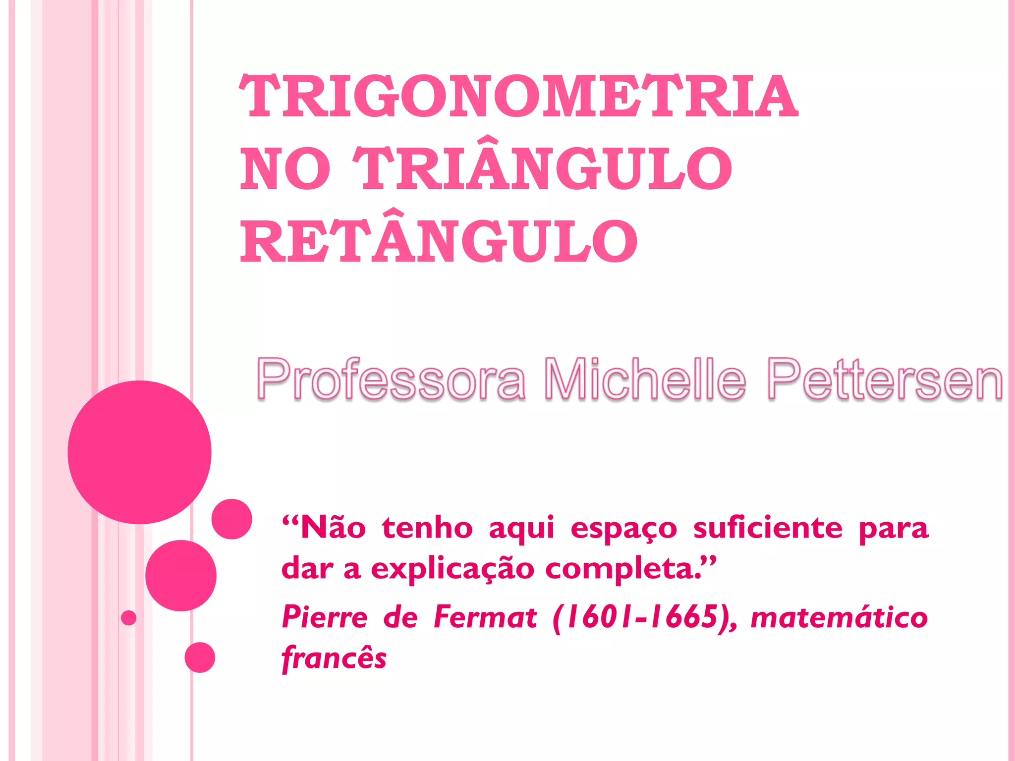 O documento discute conceitos básicos de trigonometria no triângulo retângulo, incluindo a definição de seno, cosseno e tangente como proporções entre os lados do triângulo e o Teorema de Pitágoras.
