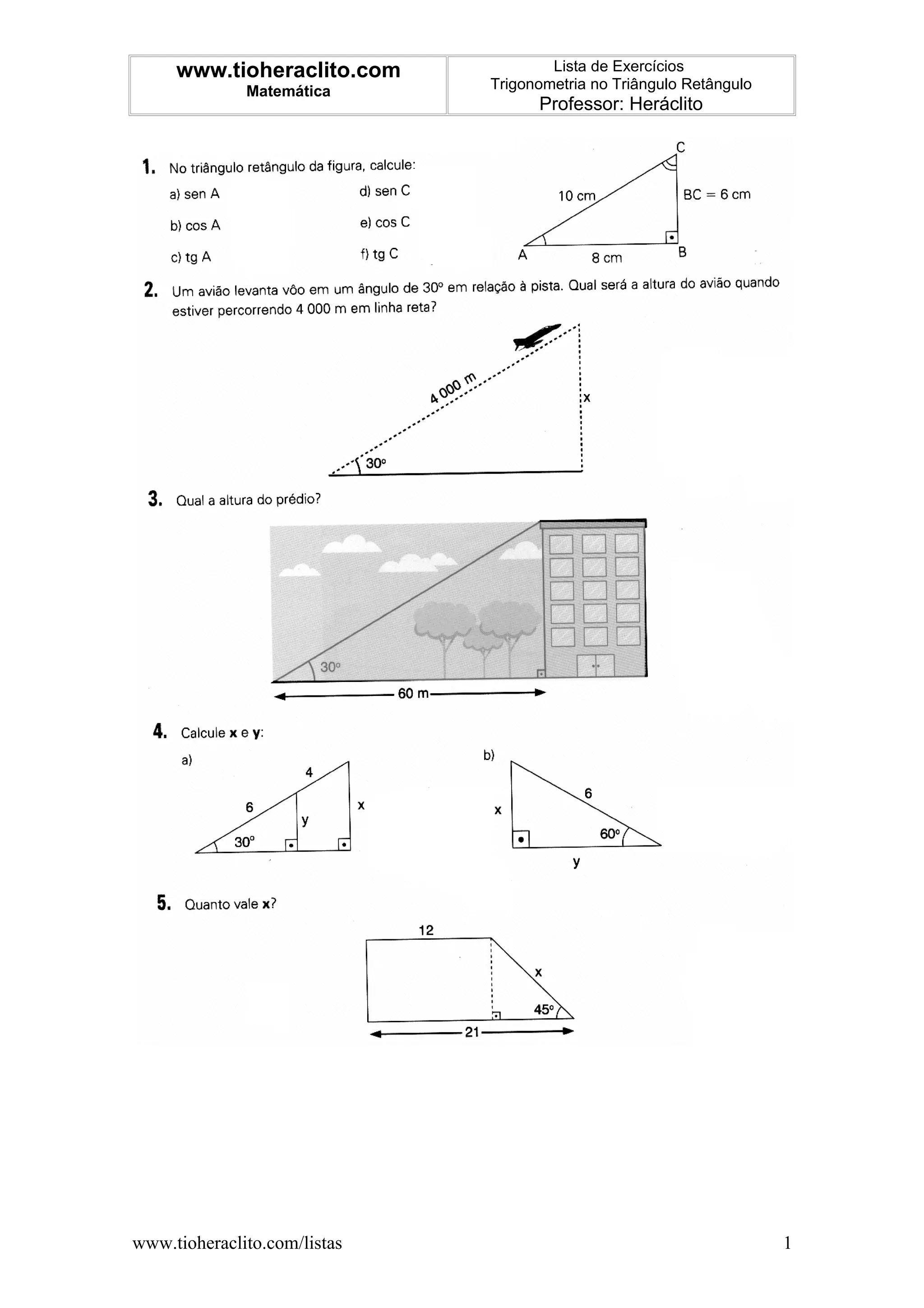 O documento é uma lista de exercícios de trigonometria no triângulo retângulo postada no site www.tioheraclito.com pelo professor Heráclito.