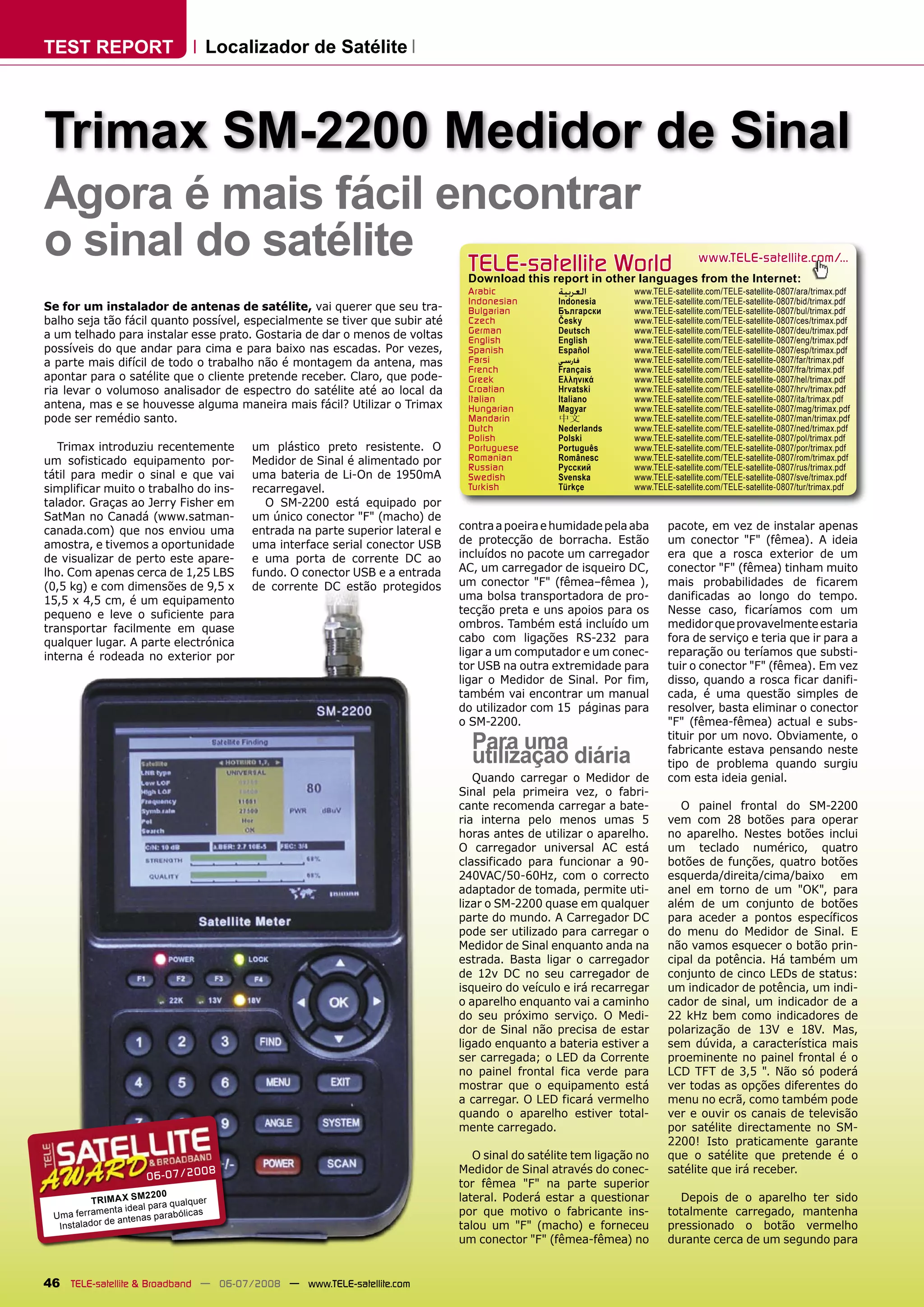 1) O documento descreve o Trimax SM-2200, um medidor de sinal portátil para instalação de antenas de satélite.