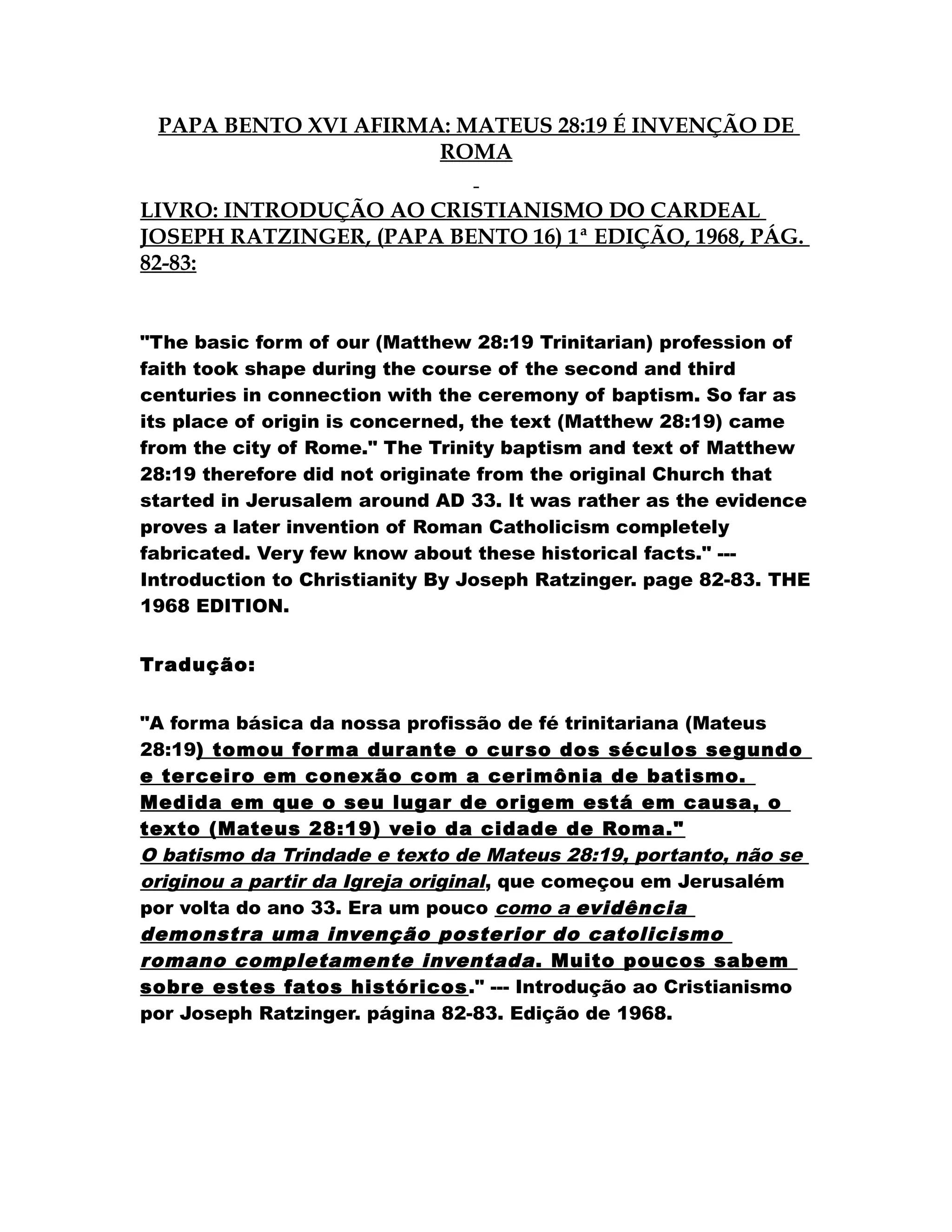 1) O Papa Bento XVI afirma que Mateus 28:19, o único versículo da Bíblia que ensina a doutrina da Trindade, é uma invenção da Igreja de Roma.