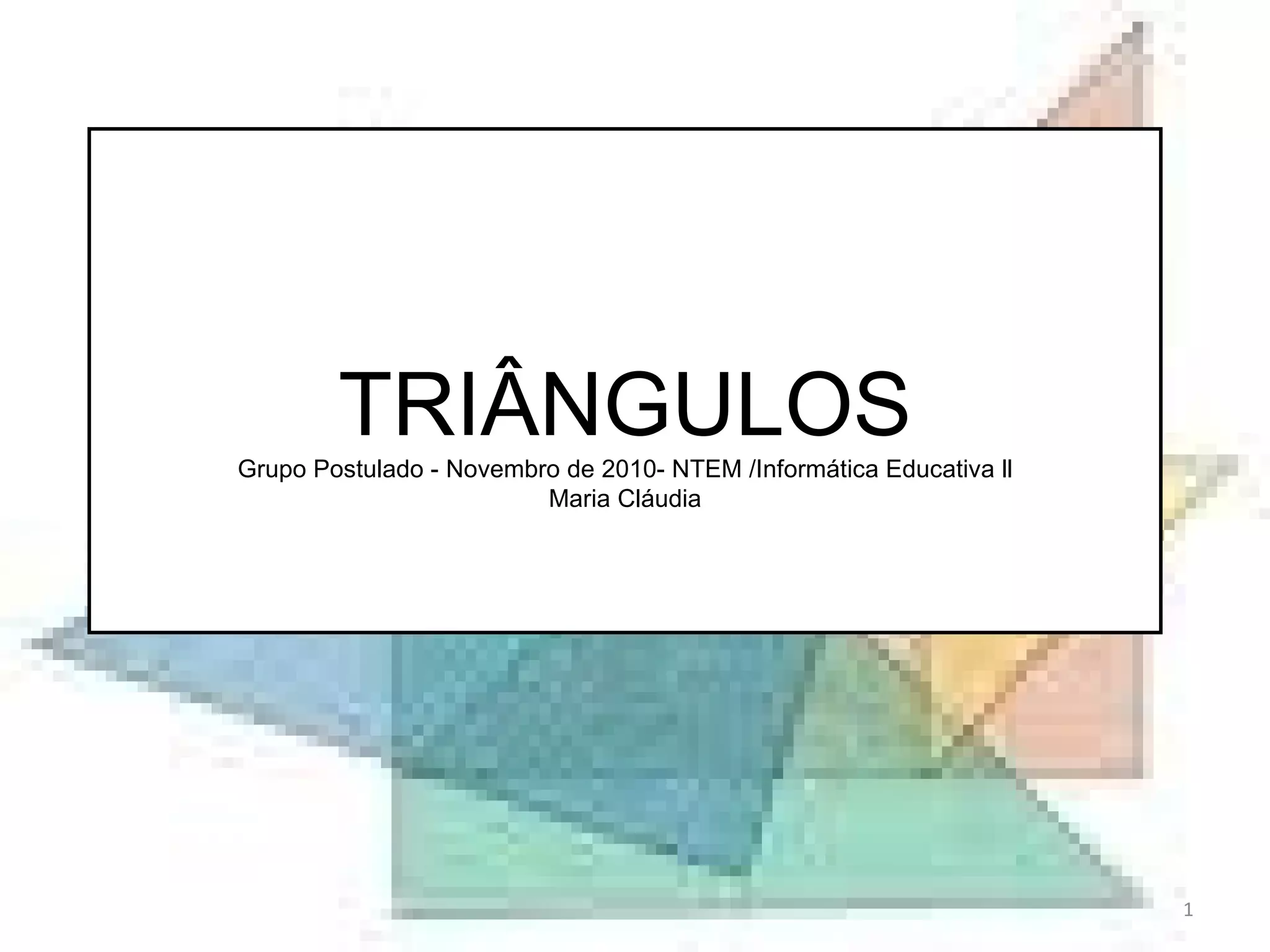 O documento apresenta um plano de aula sobre triângulos para alunos do 8o ano do ensino fundamental. Ele aborda a classificação e propriedades dos triângulos, incluindo tipos de acordo com os lados e ângulos, elementos como altura e mediana, e a soma dos ângulos internos. O documento também descreve regras para um jogo da velha sobre triângulos para revisar os conceitos ensinados.