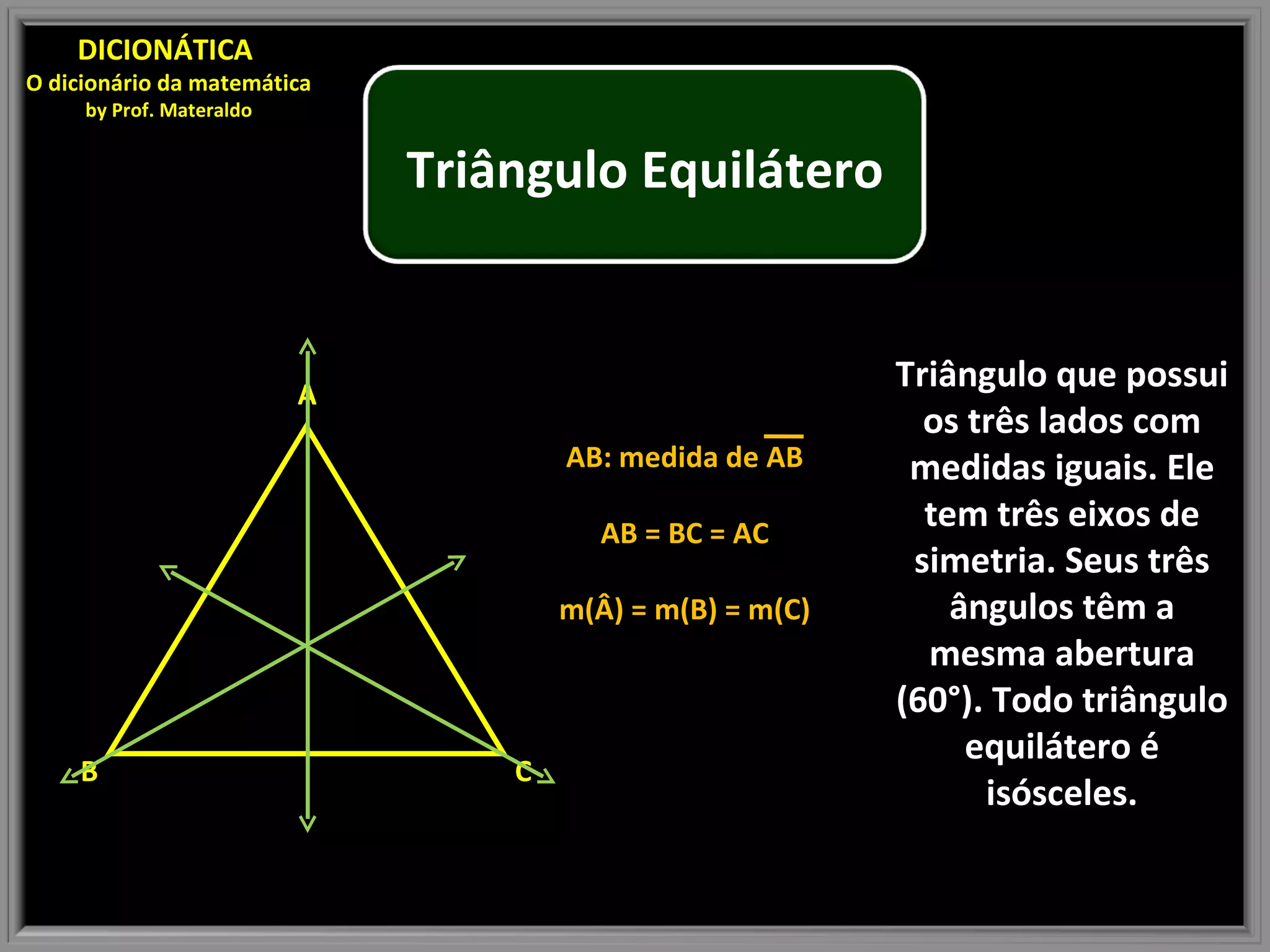 Triângulo que possuios três lados com medidas iguais. Ele tem três eixos de simetria. Seus três ângulos têm a mesma abertura (60°). Todo triângulo equilátero é isósceles. DICIONÁTICA O dicionário da matemática by Prof. Materaldo AB: medida de AB AB = BC = AC m(Â) = m(B) = m(C) Triângulo Equilátero B A C