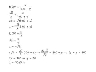 O documento discute trigonometria em triângulos retângulos, definindo seus lados como hipotenusa e catetos, e apresenta as funções trigonométricas básicas de seno, cosseno e tangente. Também apresenta o Teorema de Pitágoras e exemplos de exercícios resolvidos usando conceitos de trigonometria.