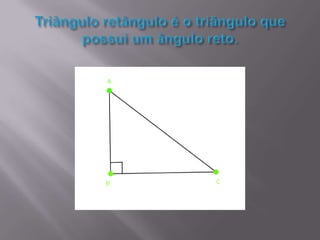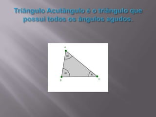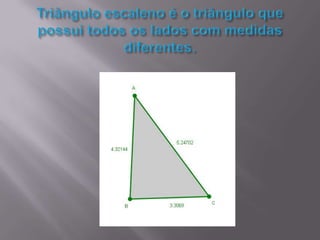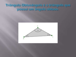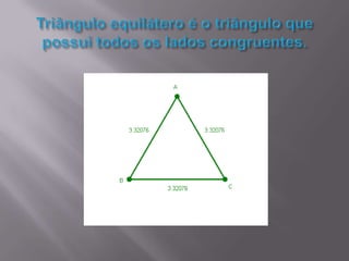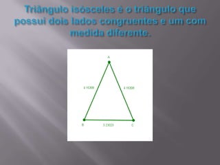 O documento discute triângulos, incluindo suas propriedades e aplicações. Primeiro, apresenta definições de triângulos equilátero, isósceles e escaleno. Em seguida, descreve como triângulos foram usados estruturalmente na Grécia Antiga e são usados atualmente. Por fim, fornece exercícios sobre triângulos isósceles.