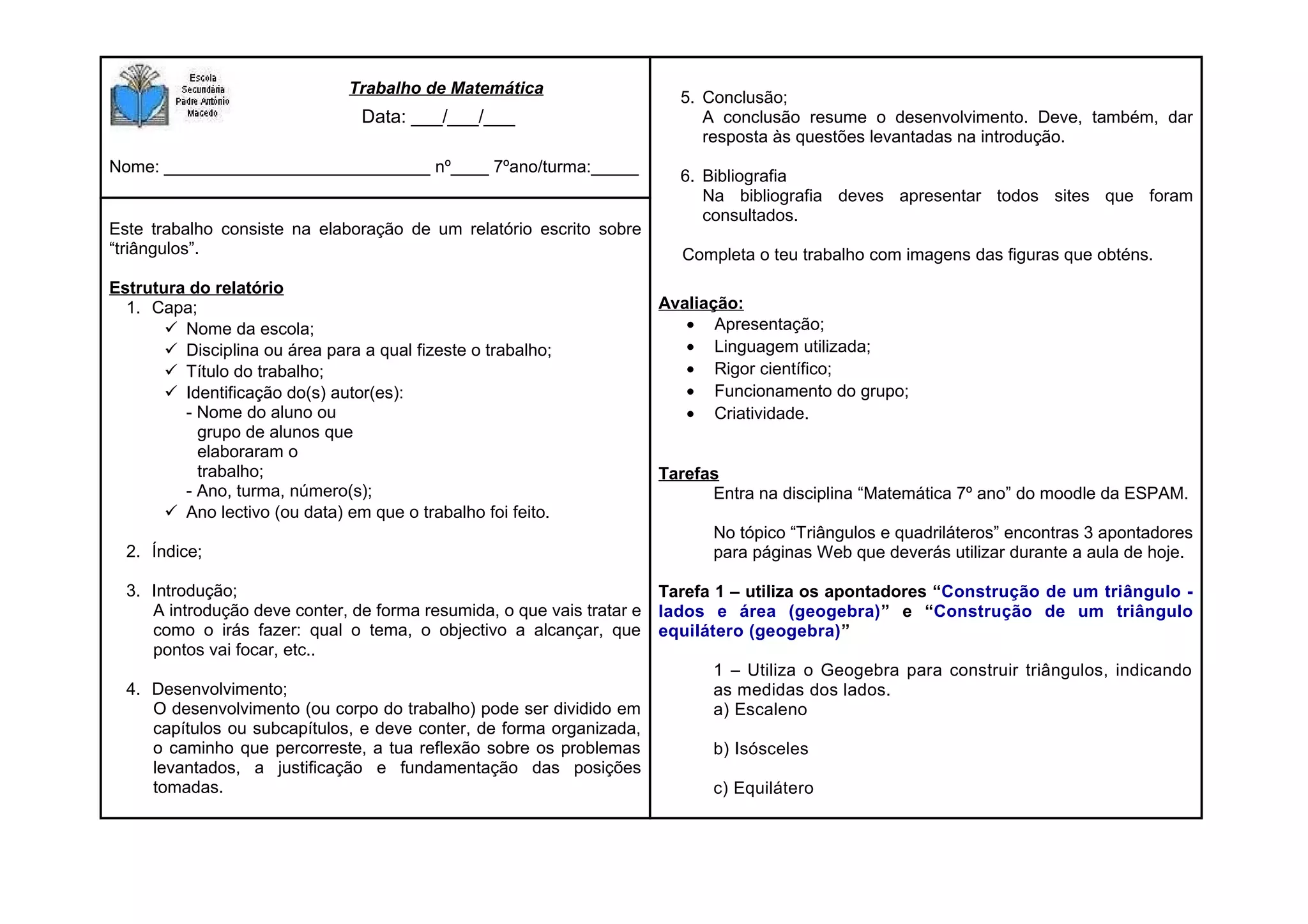 Este documento fornece instruções para a realização de um trabalho sobre triângulos utilizando o Geogebra. Inclui quatro tarefas para construir e analisar triângulos de diferentes tipos, responder perguntas sobre classificação de triângulos e relações entre lados e ângulos. Também fornece a estrutura esperada para o relatório escrito.