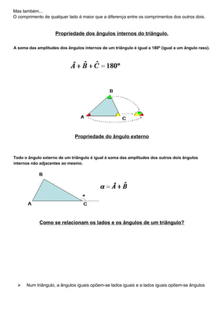 O documento classifica triângulos de acordo com seus lados e ângulos, explica a desigualdade triangular que define quando três medidas podem formar um triângulo, e descreve propriedades dos ângulos internos e externos de um triângulo e sua relação com os lados.