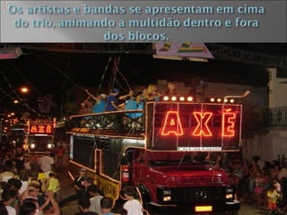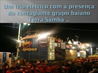 O trio elétrico é um caminhão adaptado para apresentações musicais ao vivo de samba e outros ritmos brasileiros. Surgiu em Salvador na década de 1950 e se tornou um elemento central do Carnaval da Bahia e de outras festas populares no Brasil. O Carnaval da Bahia atrai multidões por 6 dias seguidos de shows musicais nos trios elétricos e blocos ao longo de circuitos na cidade.