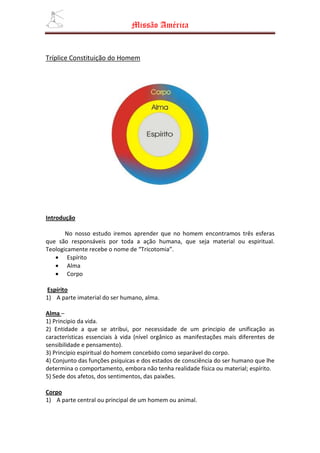 O documento discute a tríplice constituição do homem - espírito, alma e corpo. Cada parte desempenha um papel distinto, com o espírito sendo a parte imaterial responsável pelas funções espirituais, a alma sendo o princípio da vida e das funções psíquicas e emocionais, e o corpo sendo a parte material. O documento também discute como essas três partes interagem e podem ser afetadas pelo pecado ou pelo Espírito Santo.