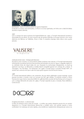A Triumph foi fundada em 1886 na Alemanha e tornou-se uma das maiores fabricantes de lingerie da Europa. Ao longo dos anos, acompanhou as tendências da moda e estilos de vida, lançando novos produtos e expandindo suas operações globalmente. Atualmente emprega entre 101-250 pessoas e comercializa uma variedade de lingerie e roupas íntimas.