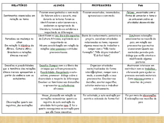 O documento descreve um projeto realizado em uma escola para ensinar sobre a cultura afro-brasileira. O projeto usou leituras, discussões, atividades artísticas e visitas a museus para ajudar as crianças a apreciarem a herança cultural africana e combater o preconceito racial. O projeto melhorou a autoestima das crianças negras e levou a uma maior compreensão sobre a diversidade cultural brasileira entre professores e alunos.
