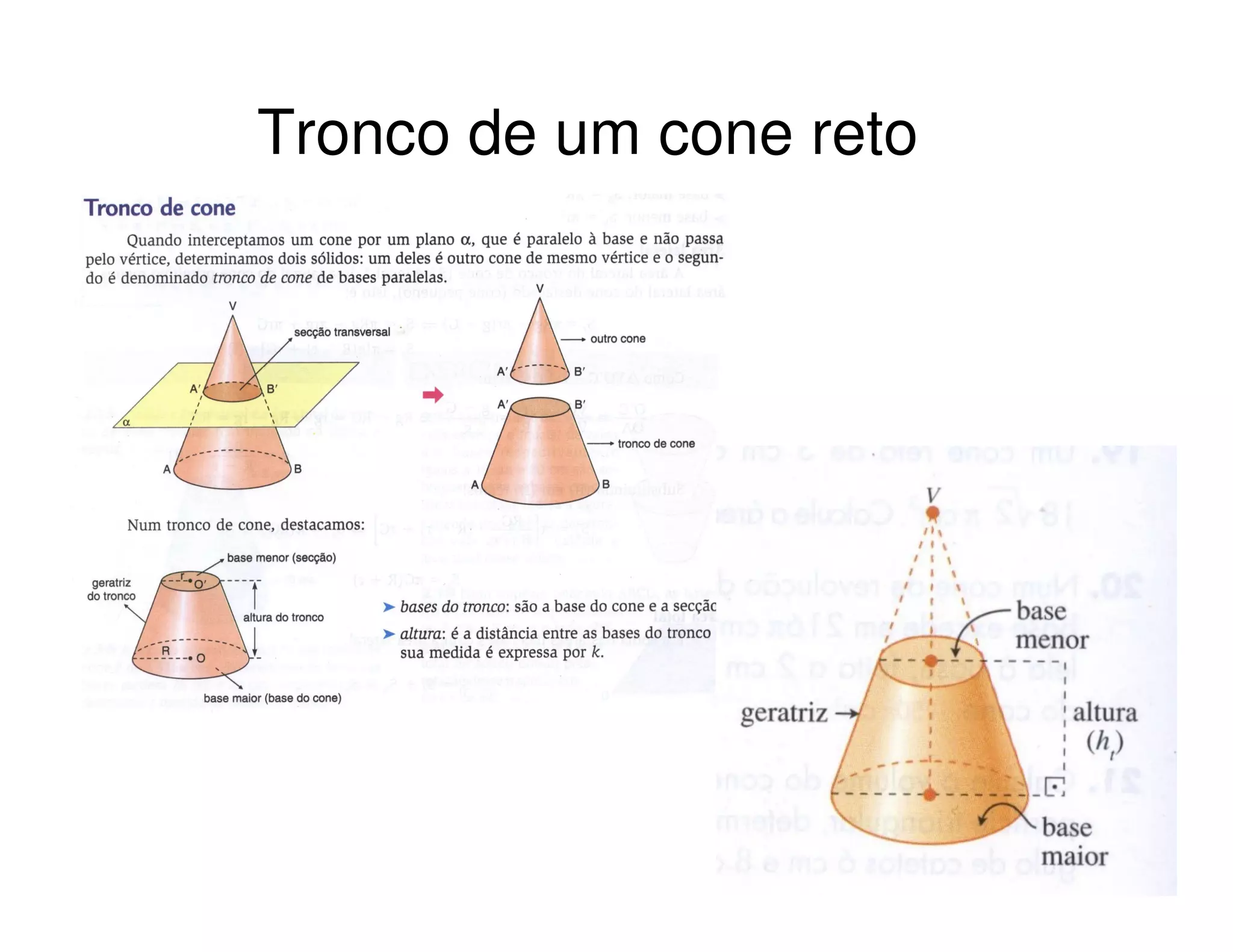 O documento fornece as fórmulas para calcular as áreas lateral, da base menor e da base maior de um cone reto, bem como a área total. A área lateral é calculada usando o comprimento da circunferência e a soma dos raios maior e menor. A área da base menor é o círculo com o raio menor e a área da base maior é o círculo com o raio maior. A área total é a soma dessas três áreas.