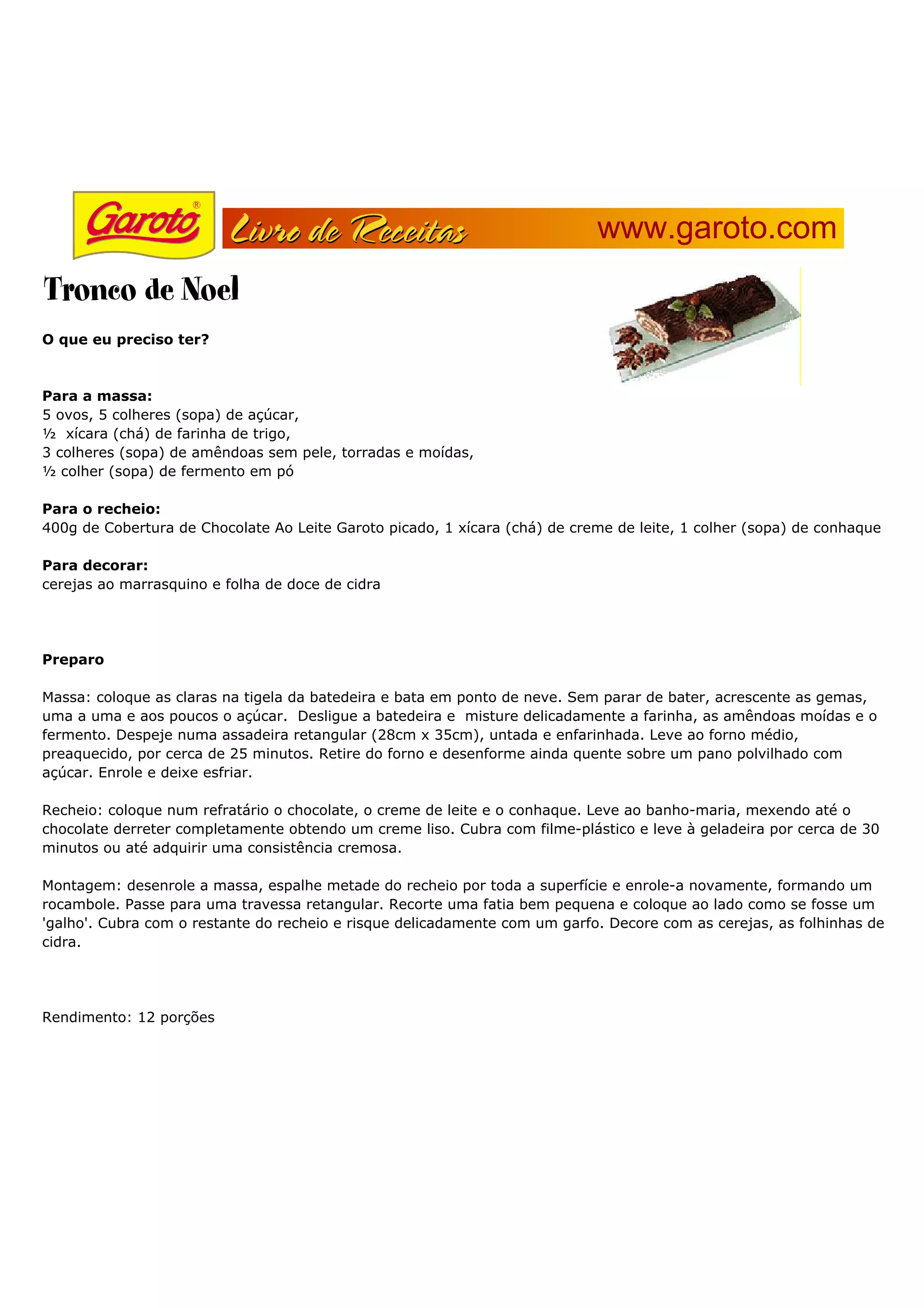 Este documento fornece uma receita para rocambole de chocolate recheado com creme de chocolate ao leite Garoto. A massa é feita com ovos, açúcar, farinha e amêndoas moídas e o recheio é um creme de chocolate ao leite, creme de leite e conhaque. A massa é enrolada com o recheio e decorada com cerejas e folhas de cidra.