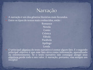 O documento discute diferentes gêneros narrativos como romance, novela, conto, crônica e fábula. Também apresenta Truman Capote como o criador do gênero do livro-reportagem, que mistura jornalismo e literatura. O documento analisa a obra "A Sangue Frio" de Capote.