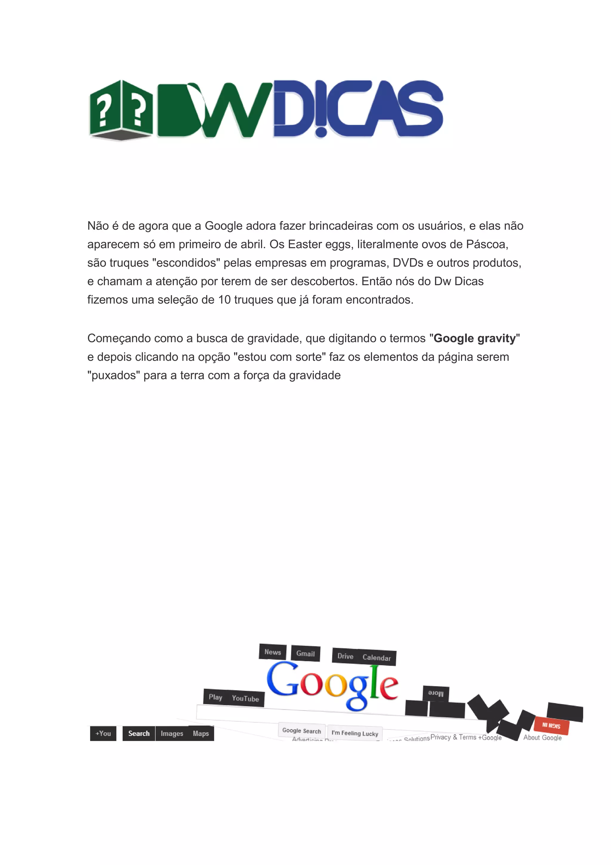 O documento apresenta uma lista de easter eggs e truques divertidos ocultos em produtos do Google e YouTube, como o efeito 'google gravity' e a interação de flocos de neve ao pesquisar 'let it snow'. Ele também menciona interações específicas, como a dança dos itens na busca do YouTube e o efeito 'tilt' no Google. Por fim, há referências a brincadeiras envolvendo o sistema Android e outros recursos que garantem entretenimento aos usuários.