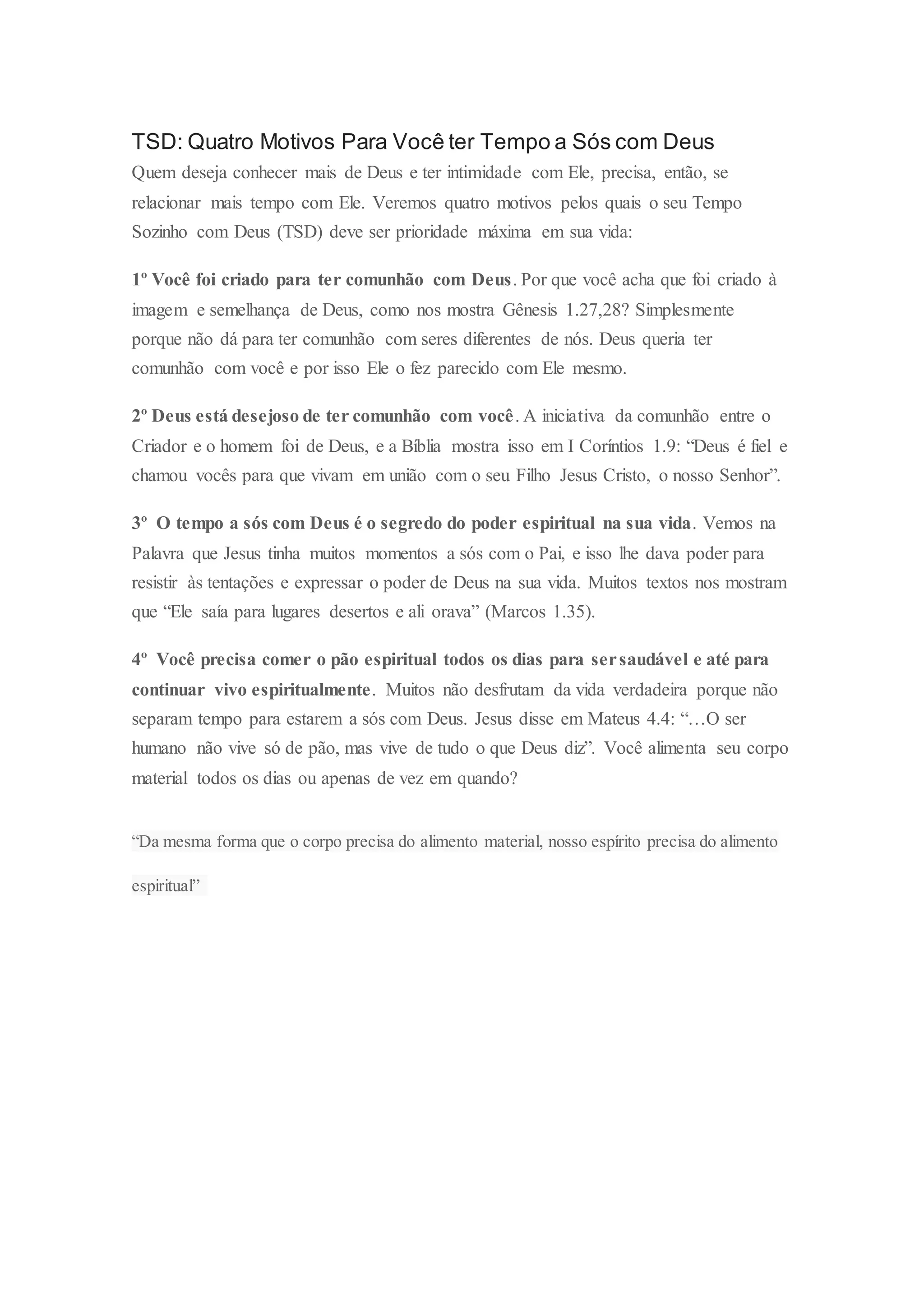 O documento discute quatro razões para ter tempo a sós com Deus: 1) Fomos criados para ter comunhão com Deus. 2) Deus deseja ter comunhão conosco. 3) O tempo a sós com Deus é essencial para o poder espiritual. 4) Precisamos "comer o pão espiritual" diariamente para sermos espiritualmente saudáveis.