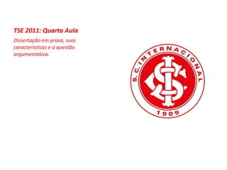 O documento fornece instruções sobre como escrever uma boa dissertação em prosa, discutindo suas características obrigatórias como impessoalidade e argumentação a partir de um ponto de vista. Também explica técnicas de argumentação como citações, comprovação com dados e raciocínio lógico.
